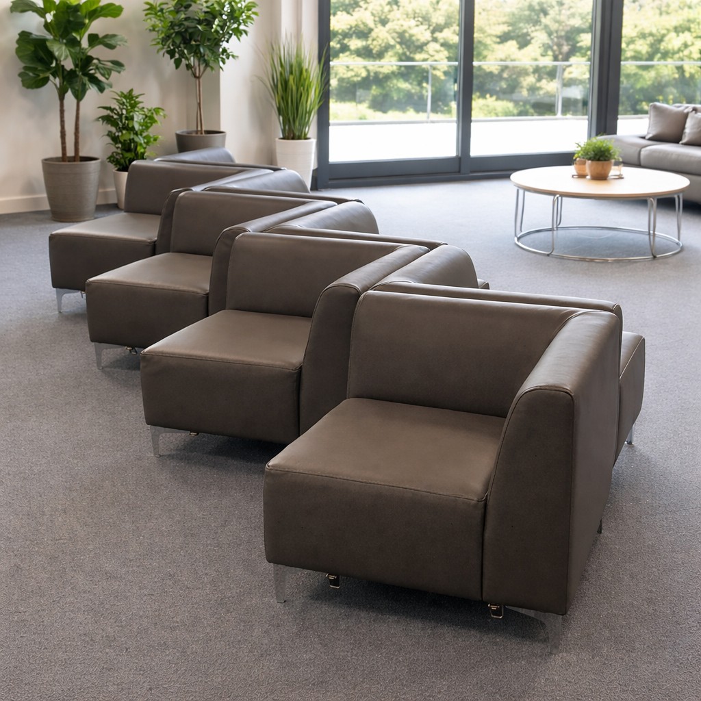 Units can be supplied with linking devices and are available with back or double back (as shows) to create a number of interesting shapes, from modular tubs, settees or zig zag applications. Legs are adjustable and are available in chrome as standard.